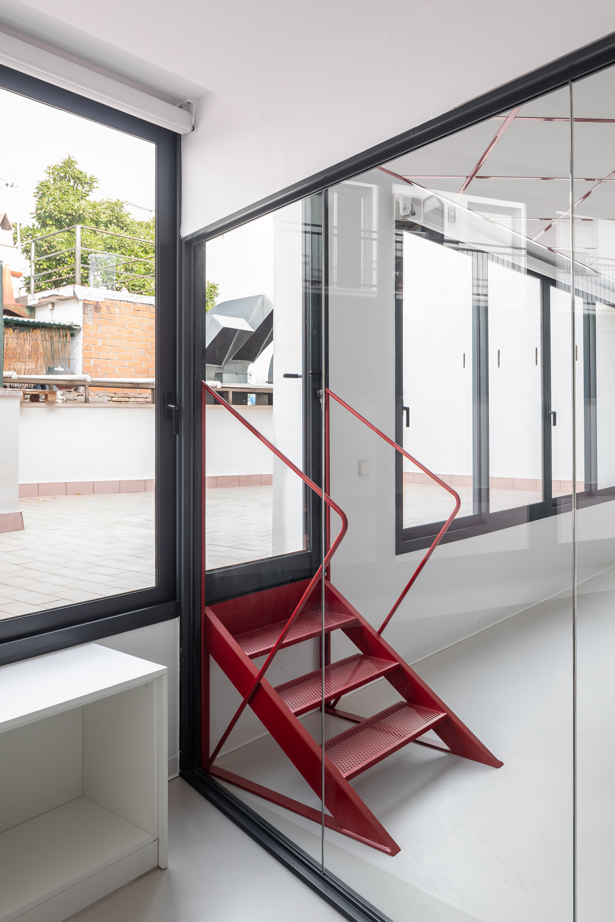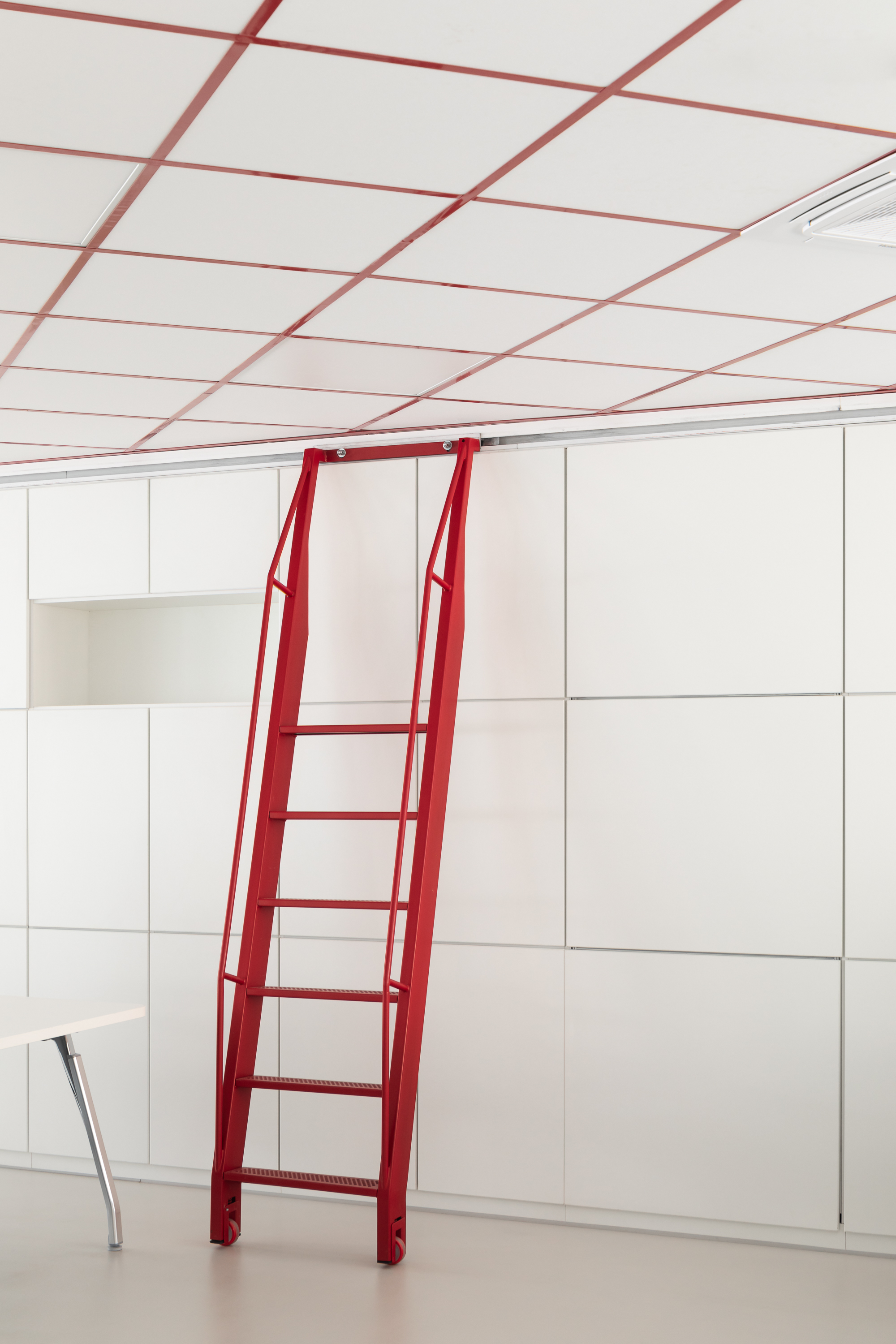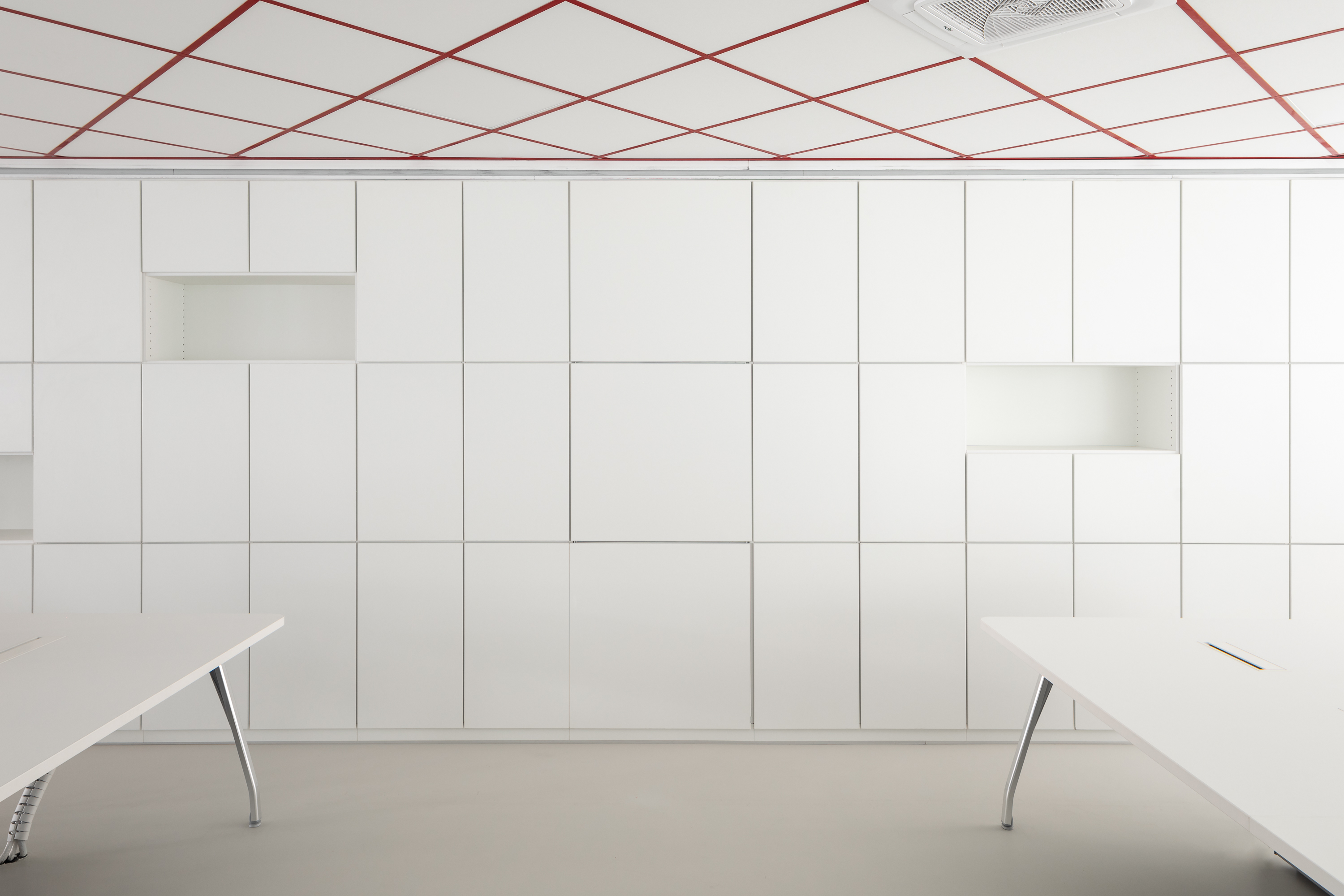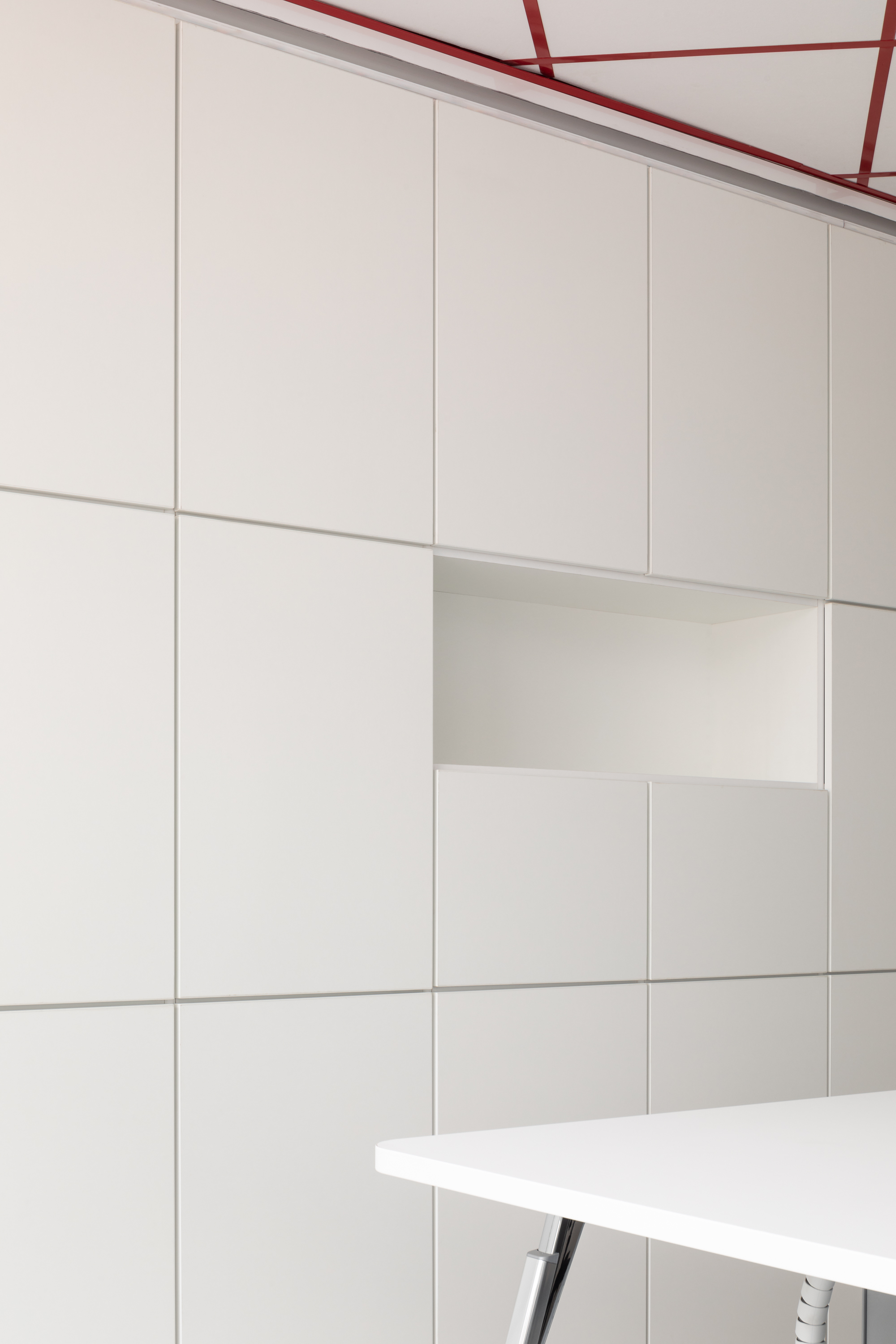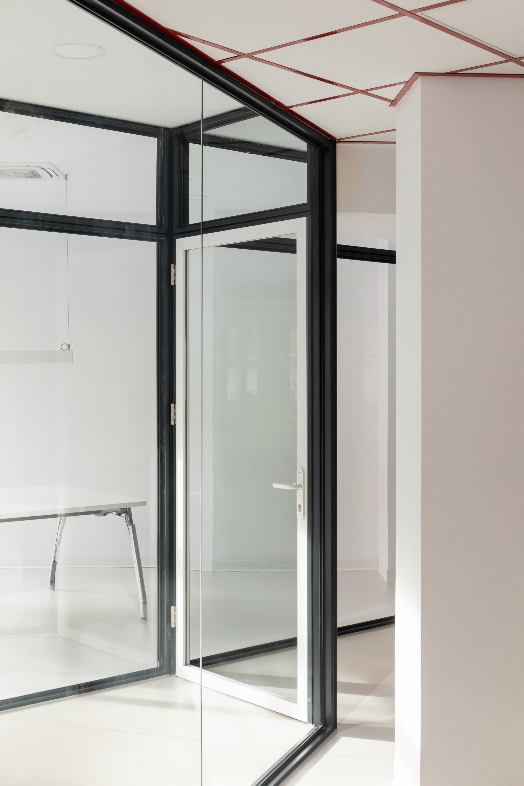 La geometria del fals sostre es reflecteix al paviment, enfatitzant aquest element i creant un efecte visual continu. El fals sostre, inicialment banal, es transforma amb un lacat en esmalt vermell, sublimant la subestructura i integrant els elements mòbils de manera coherent. El vermell, com a color d’accent, destaca sobre el fons blanc dels altres elements, aportant dinamisme. Les mampares de vidre actuen com a divisòries transparents, mantenint una sensació d’obertura i fluïdesa visual entre les zones de l’espai.