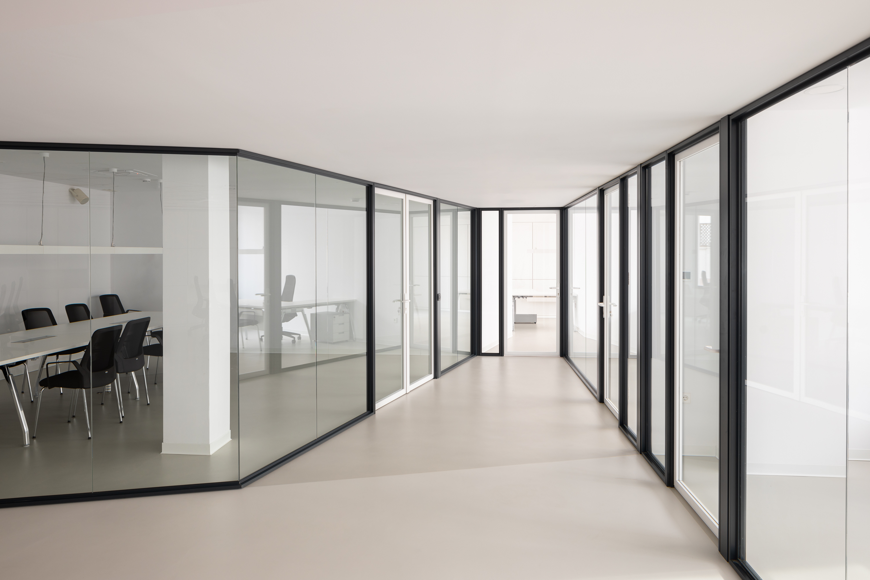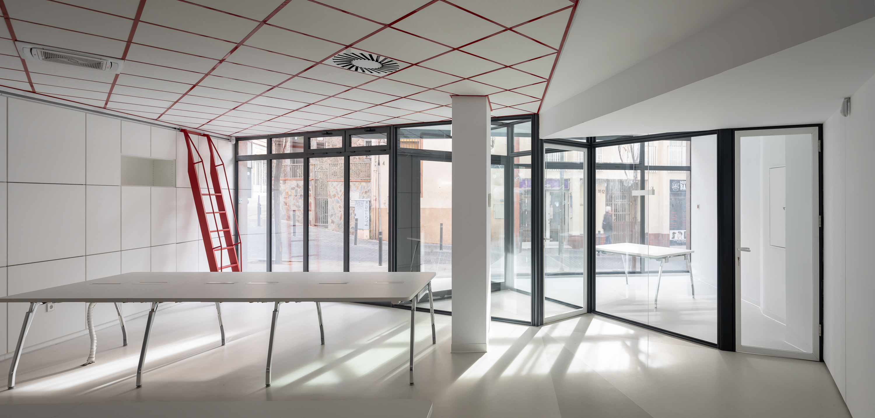 El projecte de reforma d’un local per a ús d’oficines es fonamenta en un ordre espacial amb geometria trencadissa i obliqua. El passadís connecta l’atri d’accés i permet que el carrer penetri dins de l’edifici, travessant tot l’espai. Això defineix la circulació central, que organitza les diferents zones de treball de manera dinàmica i fluïda. El local, diàfan i amb alçades variables, aprofita aquestes diferències per ordenar les zones de treball.