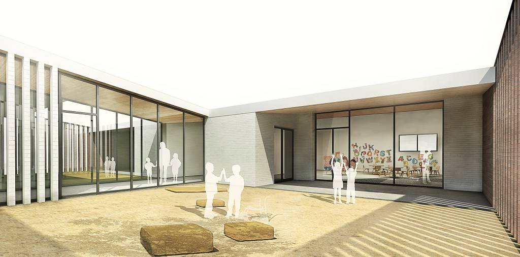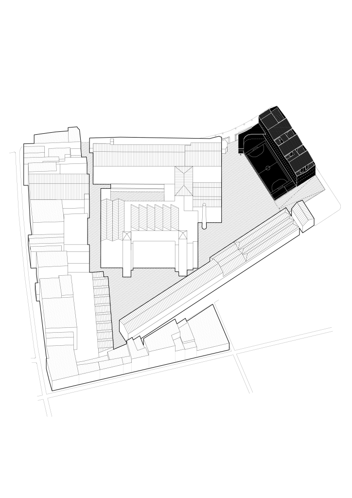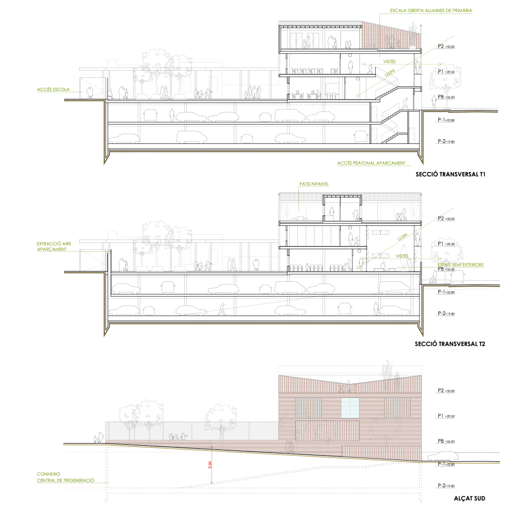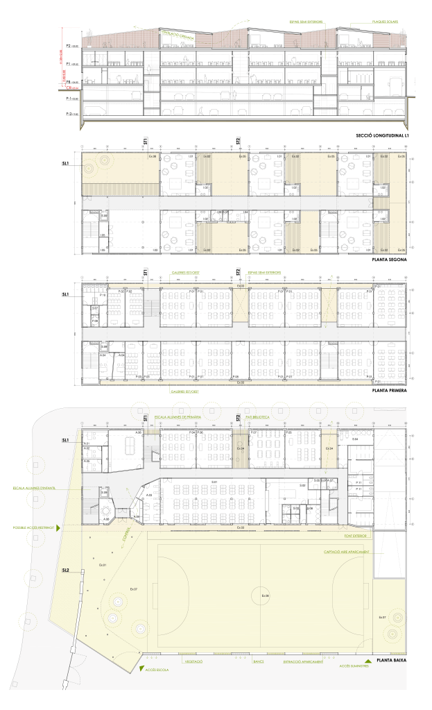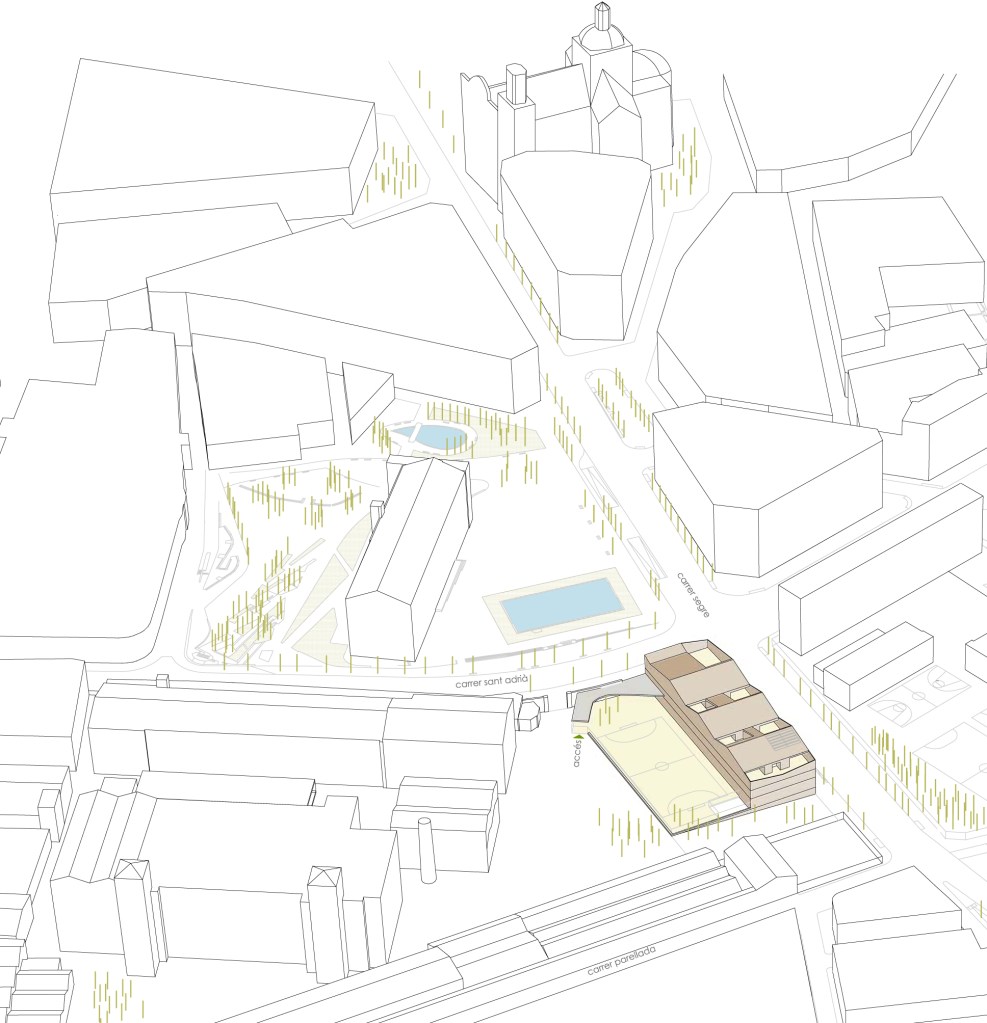 No es tracta d’una solució mimètica sinó d’una harmonització amb el context ja que les diferències derivades de la composició de les façanes, distribució i dimensió de les obertures i la utilització de la gelosia vertical del mateix material que adquireix una expressió diferent segons estigui tancant un espai a l’aire lliure, o un porxo, o una galeria o simplement formant una protecció mecànica i solar sobre les obertures, caracteritza plenament l’envolvent del nou edifici escolar amb una imatge pròpia.