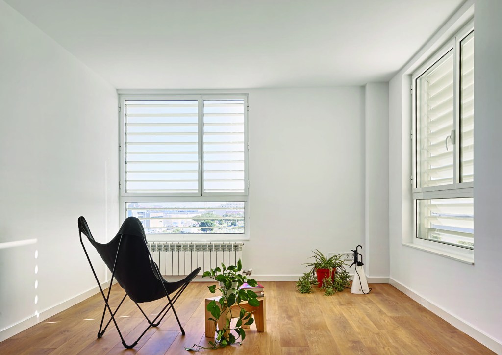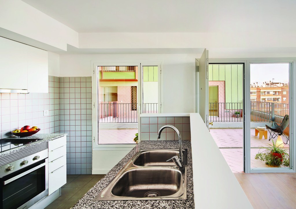 Respecte els habitatges, totes les sales estar i dormitoris són exteriors mentres que accessos, cuines i banys donen a quatre corredors que serveixen a només quatre habitatges cada un. Eliminar els 7 habitatges sobrants d’aquest esquema repetit en 7 plantes, ens serveixen para entallar el volum amb dues subtraccions de valor plàstic i efectes mediambientals notables.