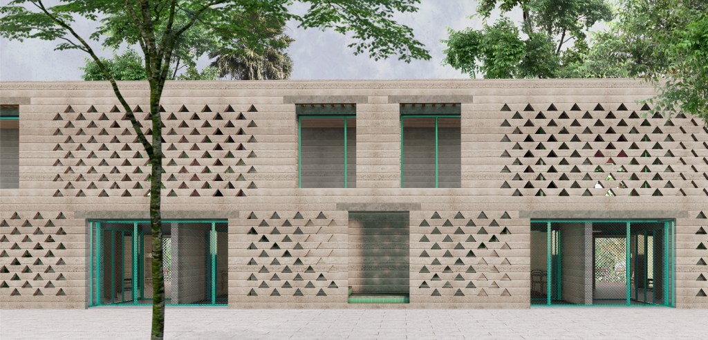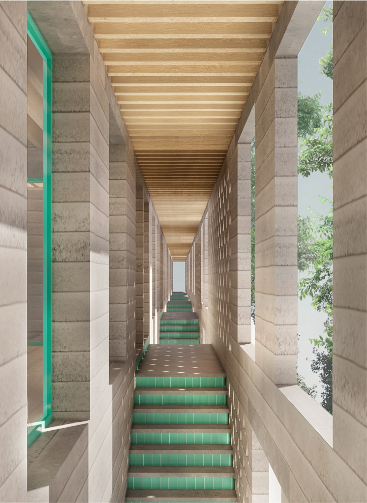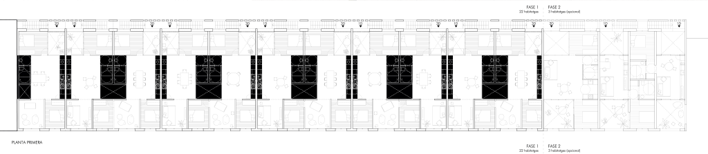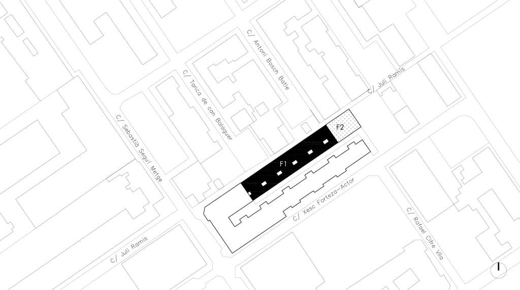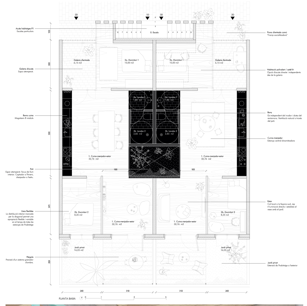 El projecte proposa un volum que colmata la mitgera veïna i crea un nou front al carrer Juli Ramis (PB+1). Al pati interior, es recula 5 metres per garantir l’assolellament i afavorir la ventilació creuada. Els patis interiors aporten llum i ventilació, actuant com a captadors solars a l’hivern i dissipadors a l’estiu. La façana principal té una gelosia que protegeix els habitatges de PB i separa l’espai públic del privat. El projecte preveu 25 habitatges en dues fases: 22 en la primera (11 de 2D i 11 de P1) i 3 en la segona. L’organització interna es divideix en franges: la socialitzadora amb accessos i escales, la galeria que connecta amb l’exterior, l’espai de servei i menjador amb patis, i la zona d’estar amb contacte amb la façana més assolellada. Els dormitoris són dobles i flexibles, organitzats sobre murs de càrrega que permeten diverses configuracions