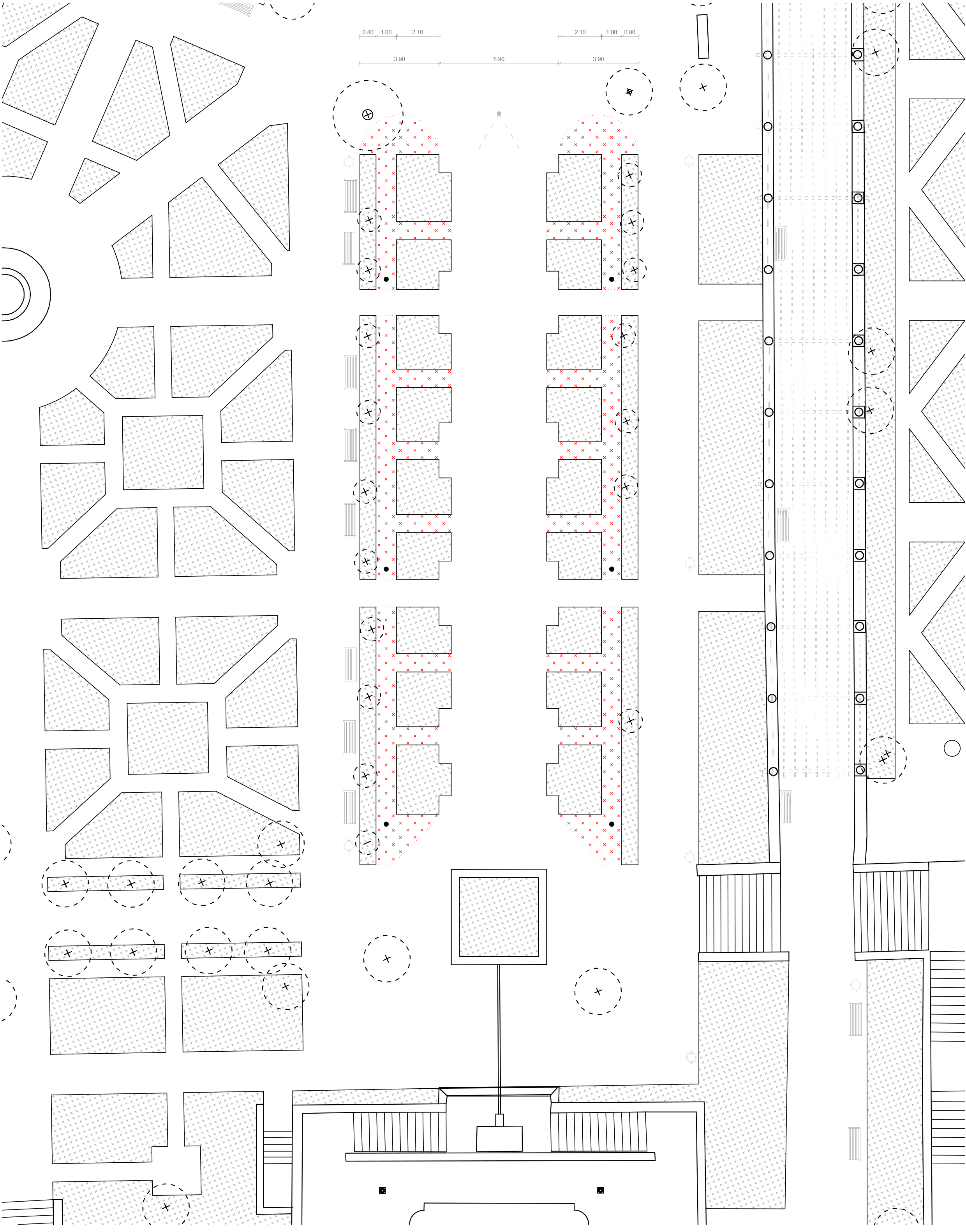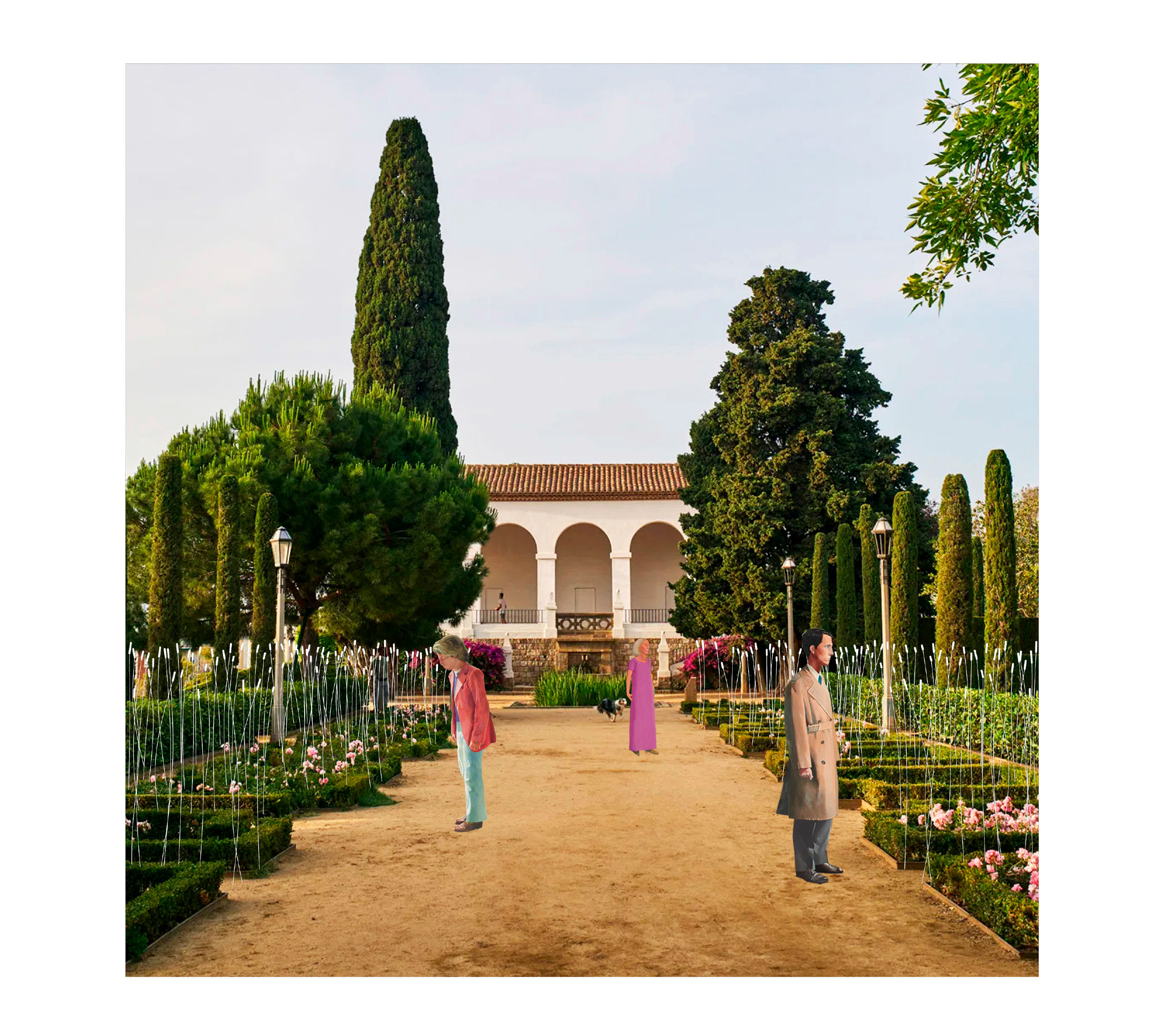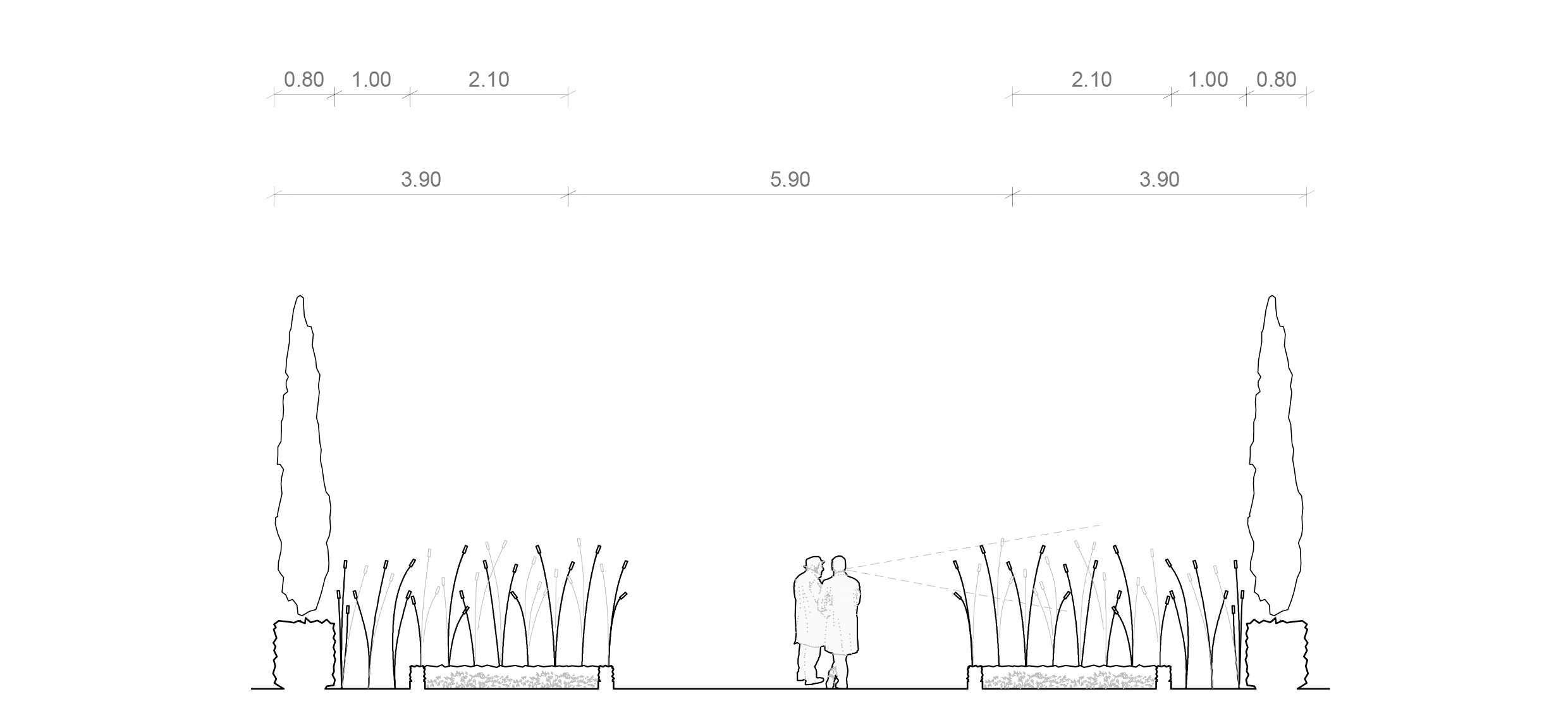 Els jardins del Grec, dissenyats per Jean-Claude Nicolas Forestier per a l’Exposició de 1929, van transformar una antiga pedrera en un espai mediterrani. Els joncs emergeixen sobre els parterres amb una geometria ortogonal i cartesiana, un contrast que evoca un passeig introductori que guia els espectadors cap al teatre.