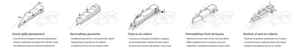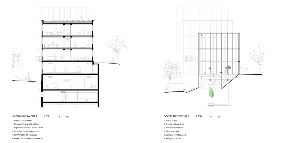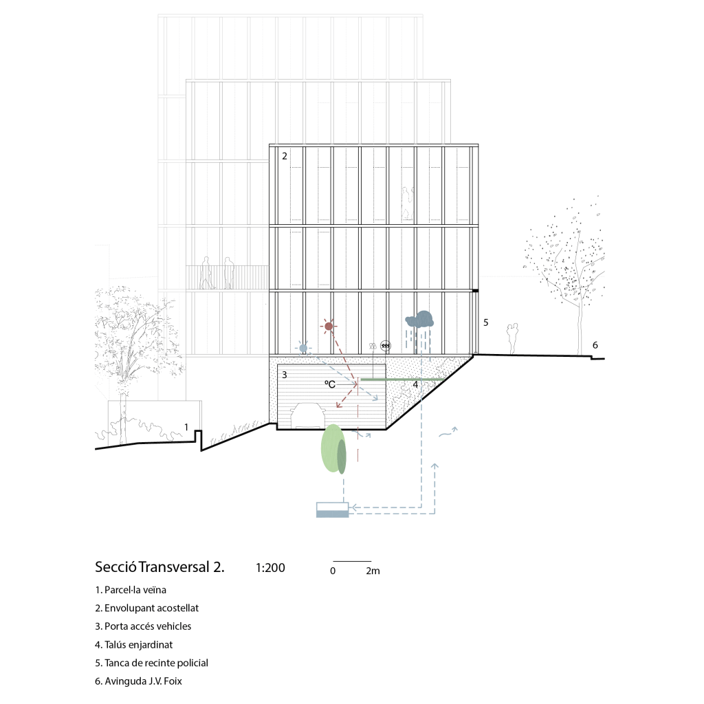 El projecte per a la nova Unitat Territorial de la Guàrdia Urbana a Sarrià-Sant Gervasi, Barcelona, consta de tres volums que defineixen un perfil esglaonat a l’Avinguda de J.V. Foix i una plaça d’accés a la Ronda de Dalt. Aquesta arquitectura es protegeix del sol i garanteix privacitat. La fragmentació de l’edifici en tres volums resol el canvi de cota i s’integra amb l’entorn verd. La coberta “verda” i els espais enjardinats milloren l’ecosistema local, amb vegetació mediterrània. A nivell constructiu, es busca simplificar la geometria i regularitzar cobertes, amb una atenció especial a la integració paisatgística i la creació de noves vistes. A més, es prioritza l’eficiència energètica mitjançant sistemes passius (inèrcia tèrmica, captació solar) i actius (energia fotovoltaica, aerotèrmia, geotèrmia). L’edifici es dissenya per a una gran funcionalitat, amb un enfocament sostenible i respectuós amb el paisatge.