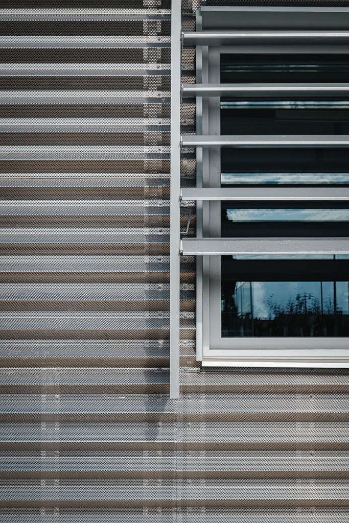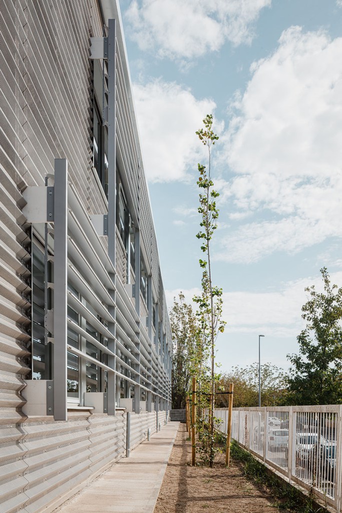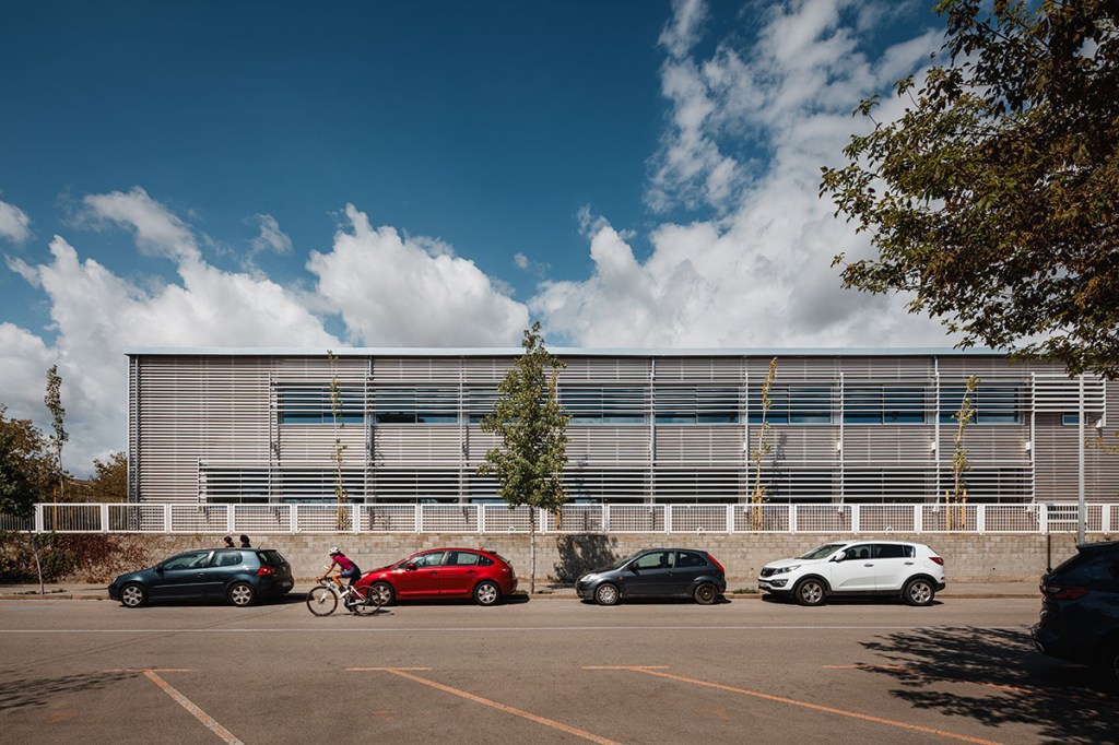 Estructura d’acer i sostres de CLT, façanes i cobertes ventilades amb full interior lleuger acabades amb xapa d’alumini natural.