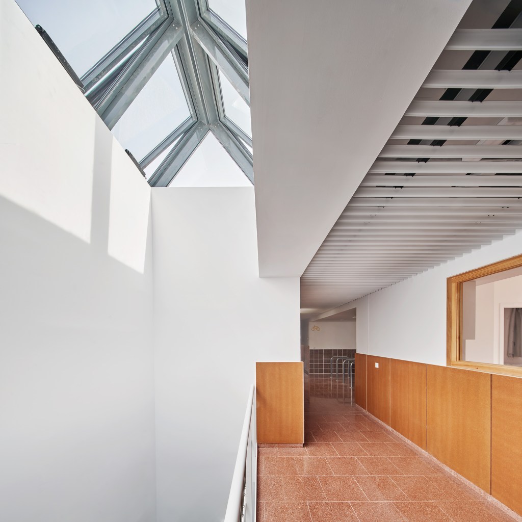Es practiquen tres buits que travessen l’edifici, aportant llum natural i ventilació creuada, i establint una connexió espacial entre les dues plantes. Aquests buits es transformen en bancs I jardineres a la planta inferior, balcó a la superior i claraboia a la coberta, millorant les qualitats ambientals i creant un espai de convivència. A més, es millora el trànsit entre el carrer i l’espai privat, generant un lloc funcional i accessible que fomenta la relació social. Amb aquestes intervencions, el projecte revitalitza l’espai i l’adapta a les necessitats del context urbà actual.