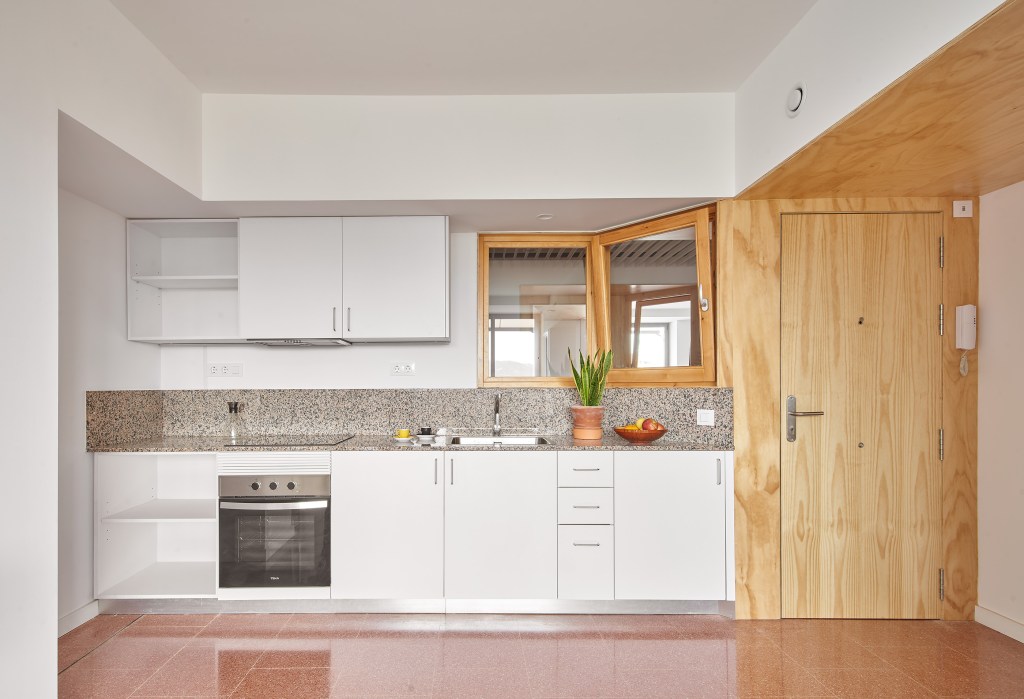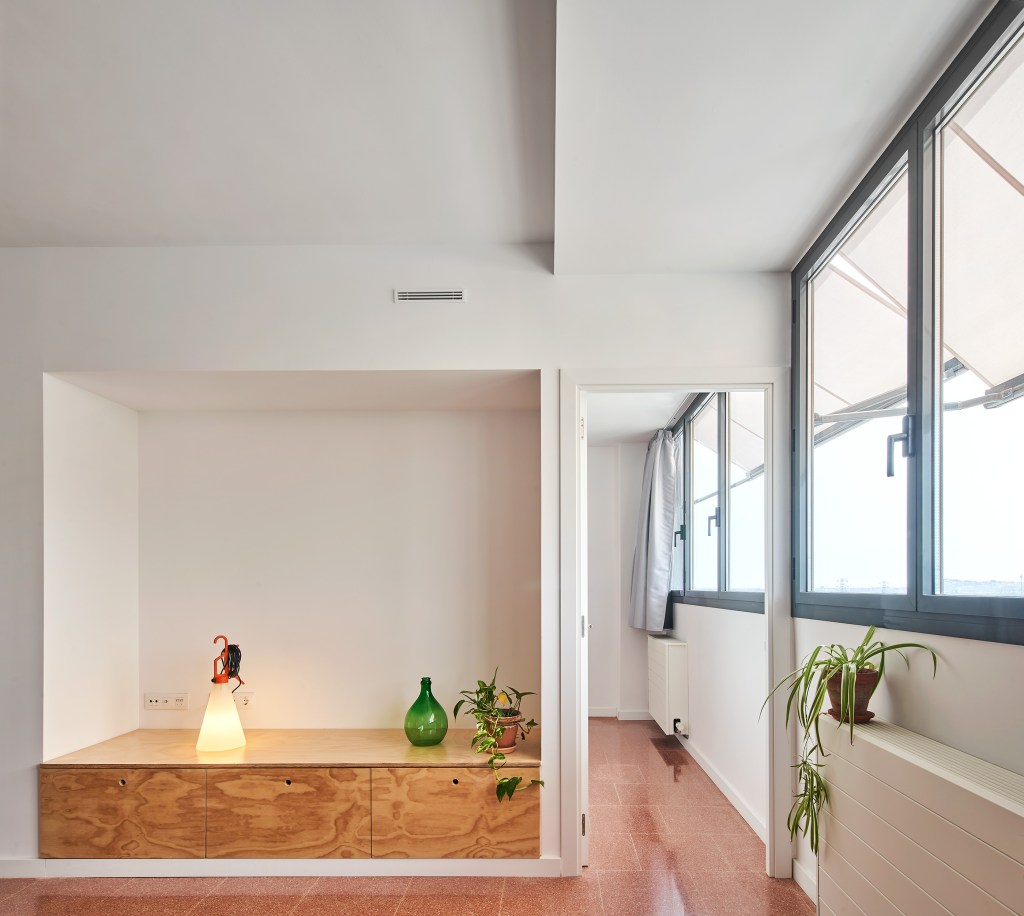 El projecte de reciclatge urbà busca reactivar les dues últimes plantes d’un edifici de usos mixtos (comerç, aparcament i oficines) que van quedar a mig construir durant la crisi econòmica. Aquestes plantes, d’uns 86 x 15 m, amb estructura de pilars de formigó armat i losa reticular, es reprogramen per donar resposta a l’emergència habitacional actual.